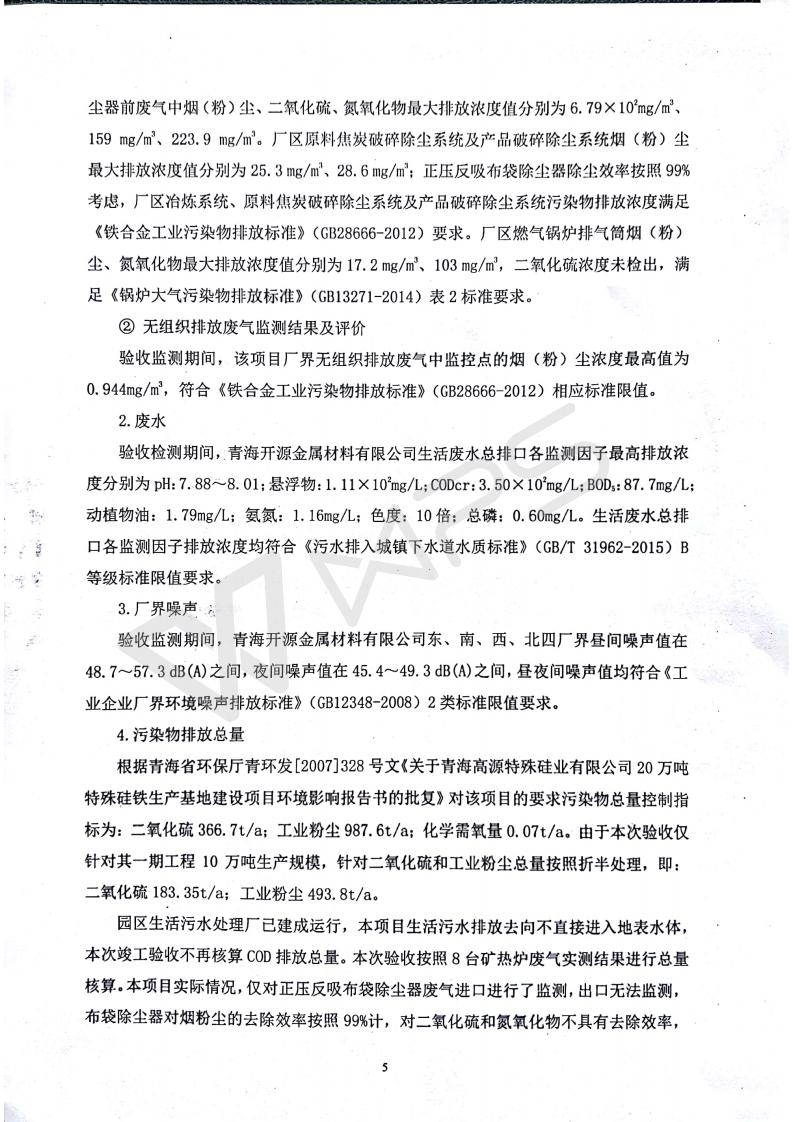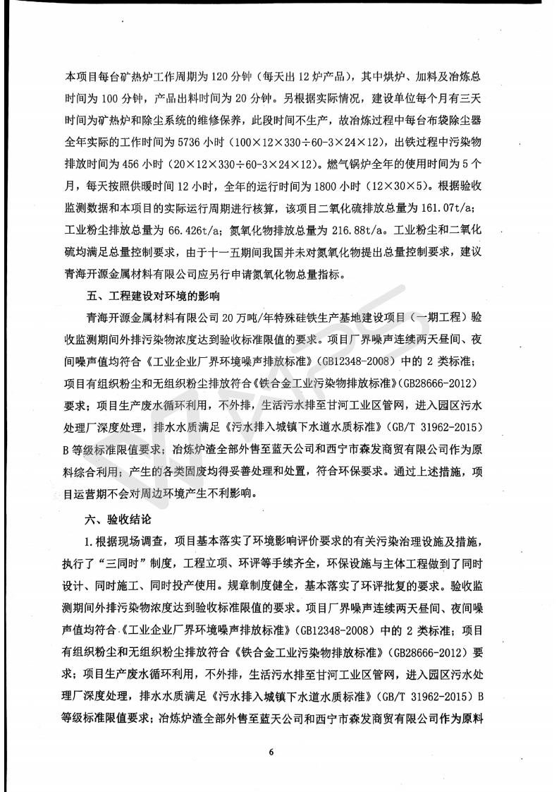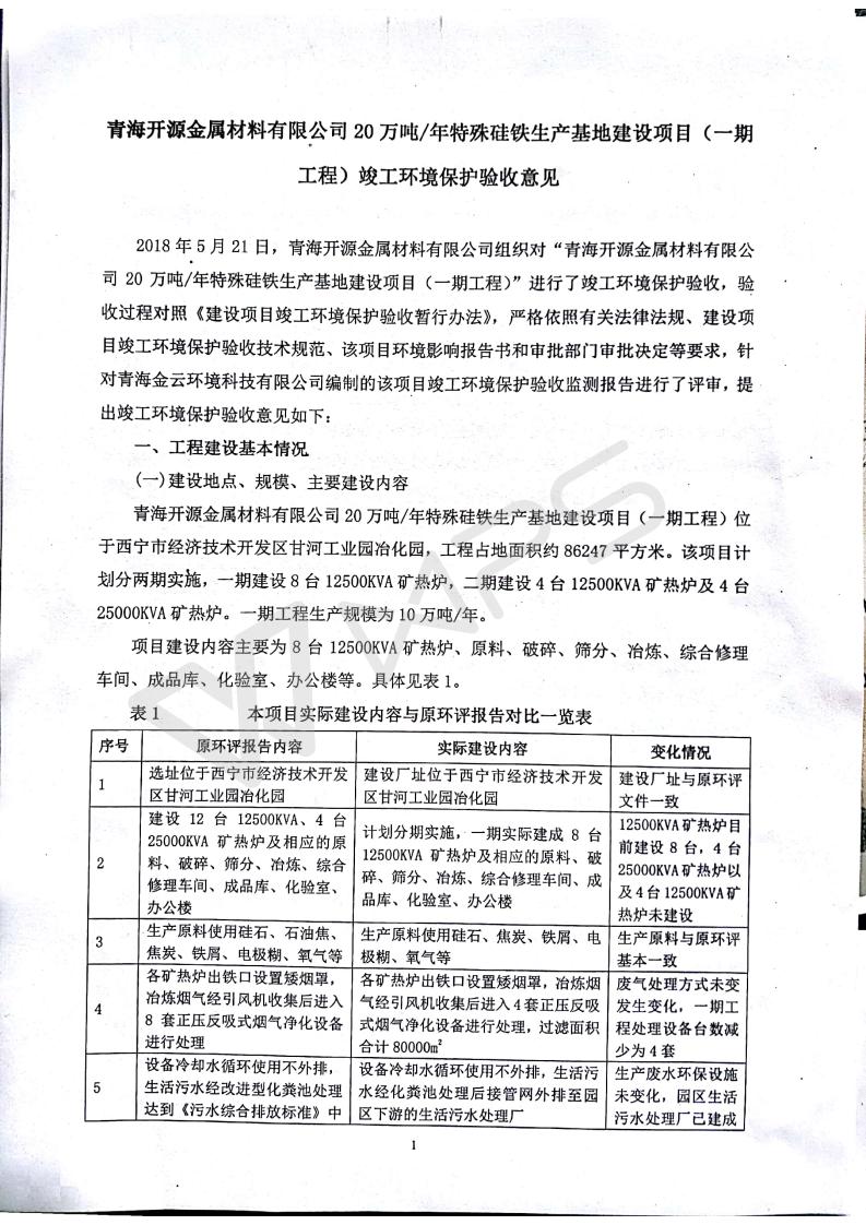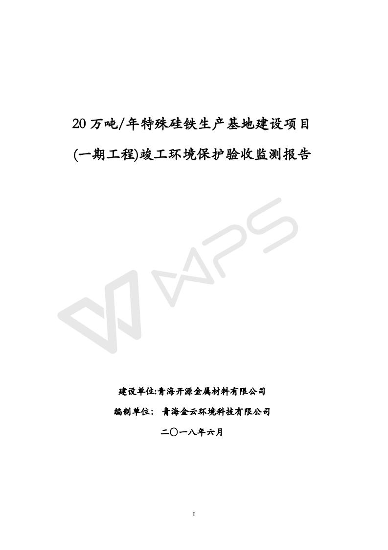 青海開源金屬材料有限公司20萬噸特殊硅鐵生產(chǎn)基地建設(shè)項目(一期工程)竣工環(huán)境保護驗收報告書會后修改20180521