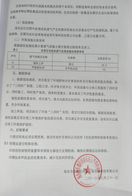 根據(jù)中華人民共和國國務(wù)院令第253號《建設(shè)項(xiàng)目環(huán)境保護(hù)管理?xiàng)l例》(中華人民共和國國務(wù)院令第682號《國務(wù)院關(guān)于修改〈建設(shè)項(xiàng)目環(huán)境保護(hù)管理?xiàng)l例〉的決定》和《建設(shè)項(xiàng)目竣工環(huán)境保護(hù)驗(yàn)收暫行辦法》,嚴(yán)格依照有關(guān)法律法規(guī),建設(shè)項(xiàng)目環(huán)境保護(hù)設(shè)施驗(yàn)收技術(shù)規(guī)范,本項(xiàng)目環(huán)評報告表和環(huán)保審批部門審批意見以及企業(yè)自行驗(yàn)收相關(guān)要求等對本項(xiàng)目進(jìn)行驗(yàn)收,本項(xiàng)目符合環(huán)保驗(yàn)收條件,可以通過環(huán)保驗(yàn)收。 海東市樂都區(qū)同泰科技有限公司竣工環(huán)境保護(hù)驗(yàn)收監(jiān)測報告公示