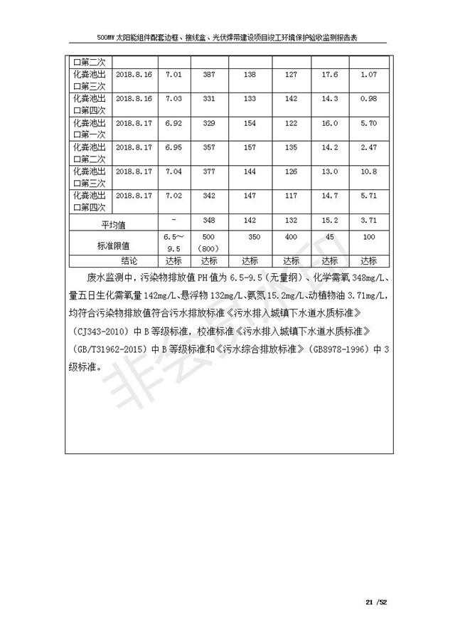 500MW太陽能組件配套邊框、接線盒、光伏焊帶建設(shè)項(xiàng)目竣工環(huán)境保護(hù)驗(yàn)收監(jiān)測報(bào)告表公示發(fā)布日期:(2018-11-16) 點(diǎn)擊次數(shù):2198 |