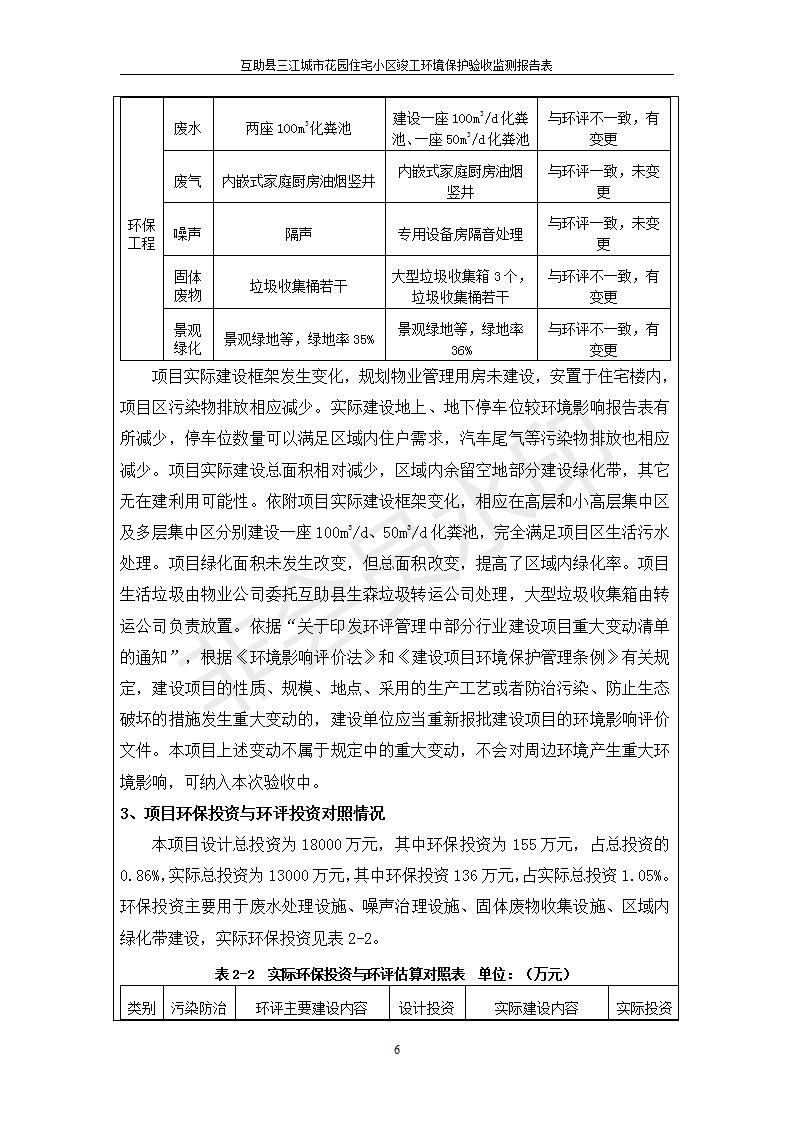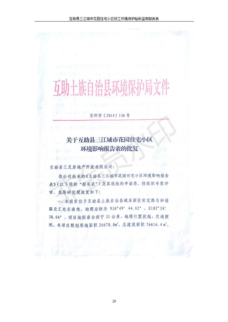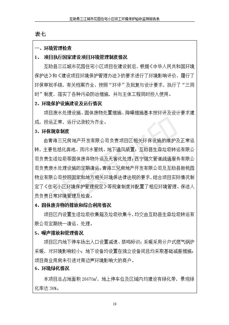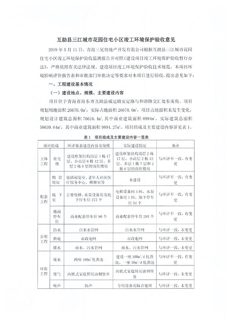 根據(jù)中華人民共和國國務(wù)院令第682號《國務(wù)院關(guān)于修改〈建設(shè)項(xiàng)目環(huán)境保護(hù)管理?xiàng)l例〉的決定》和《建設(shè)項(xiàng)目竣工環(huán)境保護(hù)驗(yàn)收暫行辦法》(國務(wù)院令682號),互助縣三江城市花園住宅小區(qū)(包括竣工環(huán)境保護(hù)驗(yàn)收監(jiān)測報告表和驗(yàn)收意見)公示如下。 一、項(xiàng)目名稱: 互助縣三江城市花園住宅小區(qū)竣工環(huán)境保護(hù)驗(yàn)收監(jiān)測報告表 二、地點(diǎn):青海省海東市互助土族自治縣威遠(yuǎn)鎮(zhèn)安定路與和諧路交匯處東南角 三、建設(shè)單位:青海三兄房地產(chǎn)開發(fā)有限公司 四、建設(shè)內(nèi)容:項(xiàng)目規(guī)劃用地面積26670.0m2,實(shí)際占地面積26670.0m2,項(xiàng)目占地面積未發(fā)生變化,規(guī)劃設(shè)計建筑總面積76616.4m2,其中商業(yè)建筑面積8994m2。實(shí)際建筑總面積58639.64m2,其中商業(yè)建筑面積9894.27m2。 五、聯(lián)系人:張工 六、聯(lián)系電 話:0971-6515411 七、公示時間:二〇一九年六月五日至二〇一九年七月三日 公示期間,對上述公示內(nèi)容如有異議,請以書面形式反饋,個人須署真實(shí)姓名,單位須加蓋公章。