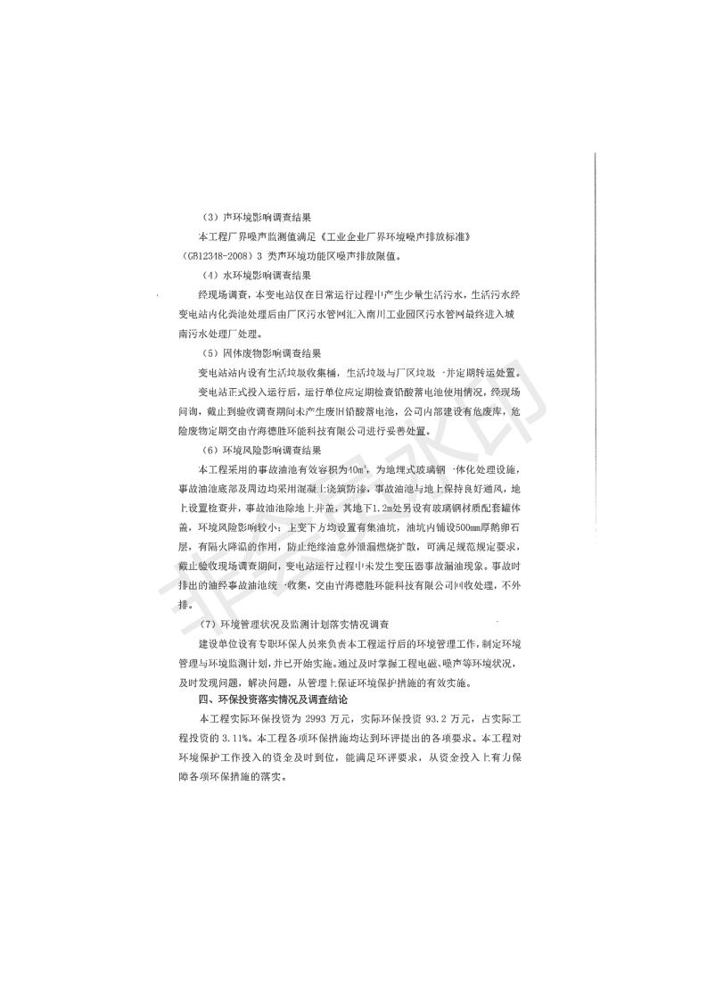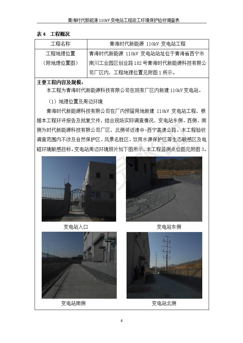 根據(jù)中華人民共和國國務(wù)院令第682號(hào)《國務(wù)院關(guān)于修改〈建設(shè)項(xiàng)目環(huán)境保護(hù)管理?xiàng)l例〉的決定》和《建設(shè)項(xiàng)目竣工環(huán)境保護(hù)驗(yàn)收暫行辦法》(國務(wù)院令682號(hào)),青海時(shí)代新能源110kV變電站工程(包括竣工環(huán)境保護(hù)驗(yàn)收調(diào)查表和驗(yàn)收意見)公示如下。 一、項(xiàng)目名稱:青海時(shí)代新能源110kV變電站工程 二、地點(diǎn):青海省西寧市南川工業(yè)園區(qū)創(chuàng)業(yè)路182號(hào)青海時(shí)代新能源科技有限公司廠區(qū)內(nèi) 三、建設(shè)單位:青海時(shí)代新能源科技有限公司 四、建設(shè)內(nèi)容:青海時(shí)代新能源 110kV 變電站采用全戶內(nèi)布置方式,依據(jù)環(huán)評(píng)報(bào)告及批復(fù)文件,經(jīng)現(xiàn)場踏勘本工程建設(shè)只包含變電站建設(shè)部分,輸電線路由南川工業(yè)園區(qū)管委會(huì)負(fù)責(zé)建設(shè),輸電線路不屬于本次驗(yàn)收調(diào)查范圍。工程本期規(guī)模2×31.5MVA,電壓等級(jí)為110/10kV。變電站 110kV 出線間隔最終2回,本期建設(shè)出線間隔2回;10kV最終電纜出線8回,本期電纜出線6回。 五、聯(lián)系人:張工 六、聯(lián)系電話:0971-6515411 七、公示時(shí)間:二〇二〇年一月十四日至二〇二〇年二月十三日 公示期間,對上述公示內(nèi)容如有異議,請以書面形式反饋,個(gè)人須署真實(shí)姓名,單位須加蓋公章。