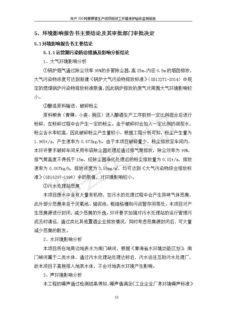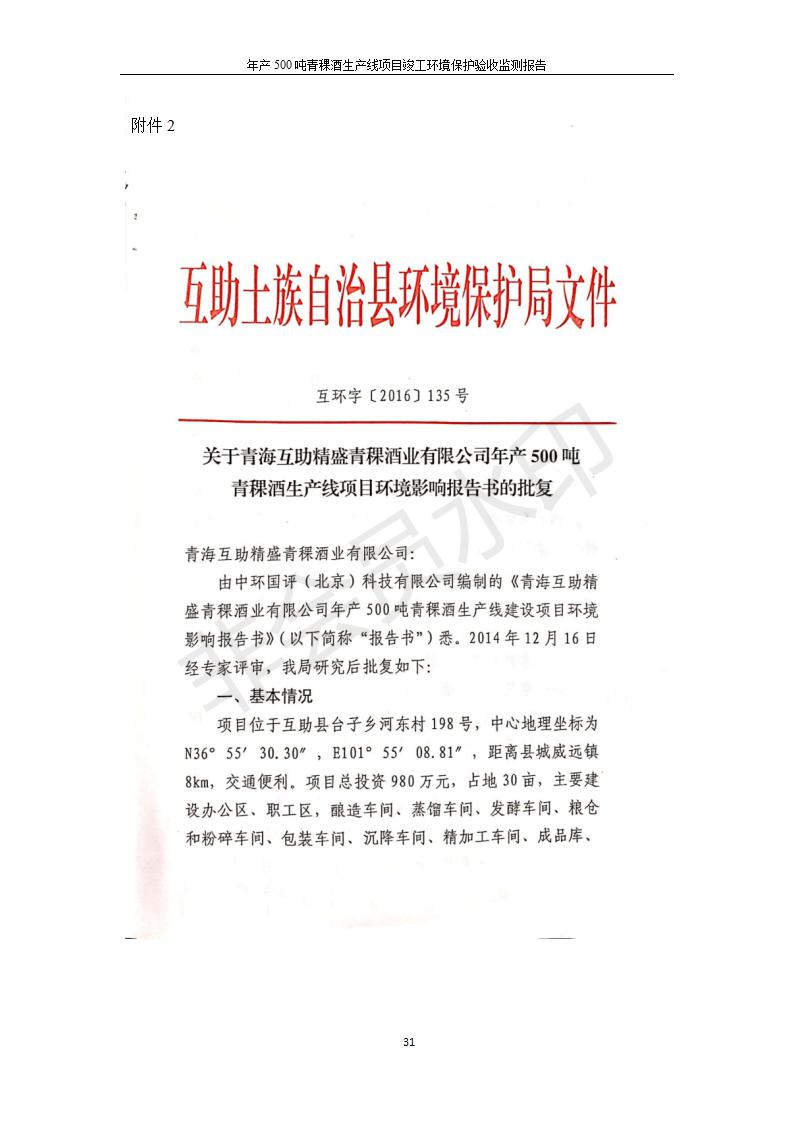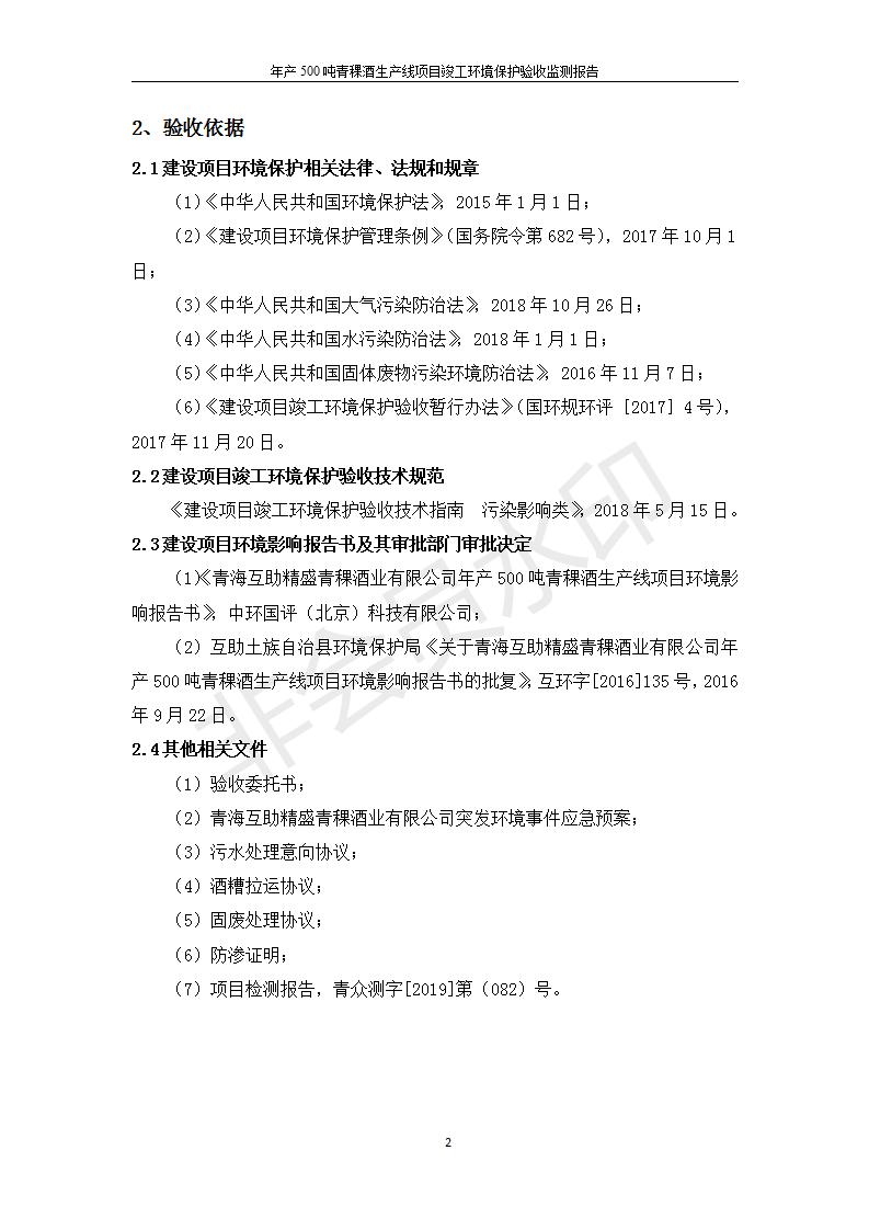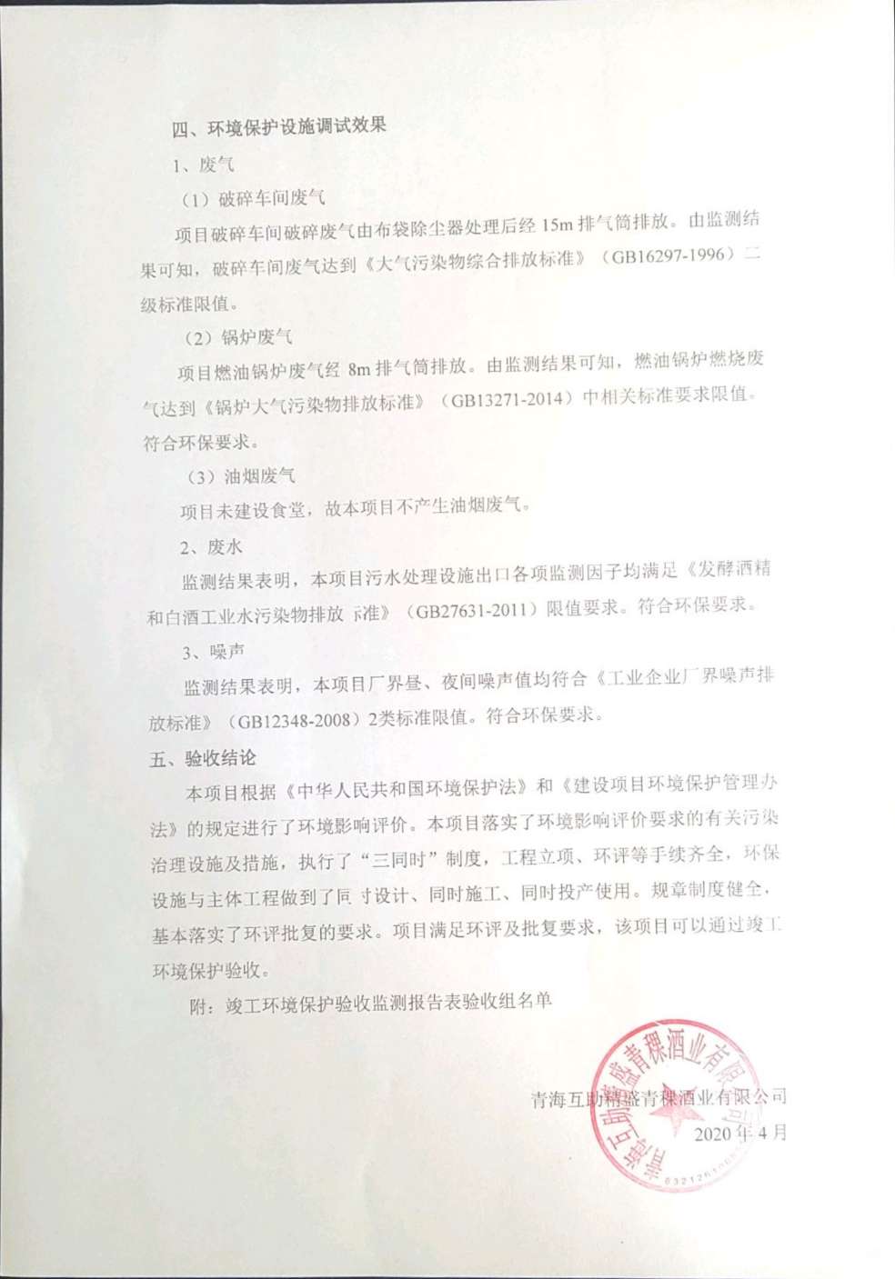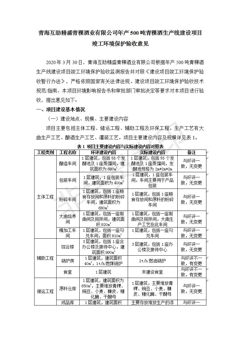 根據(jù)中華人民共和國(guó)國(guó)務(wù)院令第682號(hào)《國(guó)務(wù)院關(guān)于修改〈建設(shè)項(xiàng)目環(huán)境保護(hù)管理?xiàng)l例〉的決定》和《建設(shè)項(xiàng)目竣工環(huán)境保護(hù)驗(yàn)收暫行辦法》(國(guó)務(wù)院令682號(hào)),綜合檢測(cè)實(shí)驗(yàn)室建設(shè)項(xiàng)目(包括竣工環(huán)境保護(hù)驗(yàn)收監(jiān)測(cè)報(bào)告表和驗(yàn)收意見(jiàn))公示如下。 一、項(xiàng)目名稱(chēng):青;ブ⑶囡茦I(yè)有限公司年產(chǎn)500噸青稞酒業(yè)生產(chǎn)線建設(shè)項(xiàng)目 二、地點(diǎn):青海省海東市互助土族自治縣臺(tái)子鄉(xiāng)河?xùn)|村198號(hào)