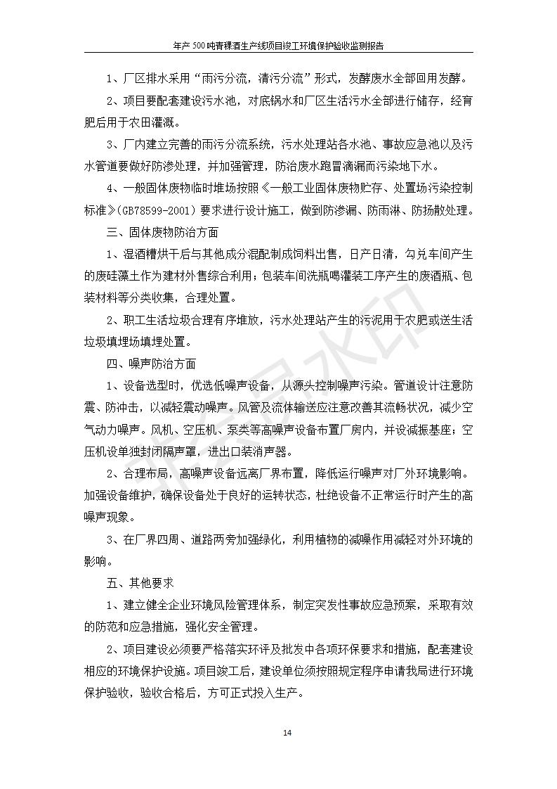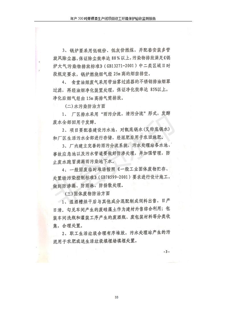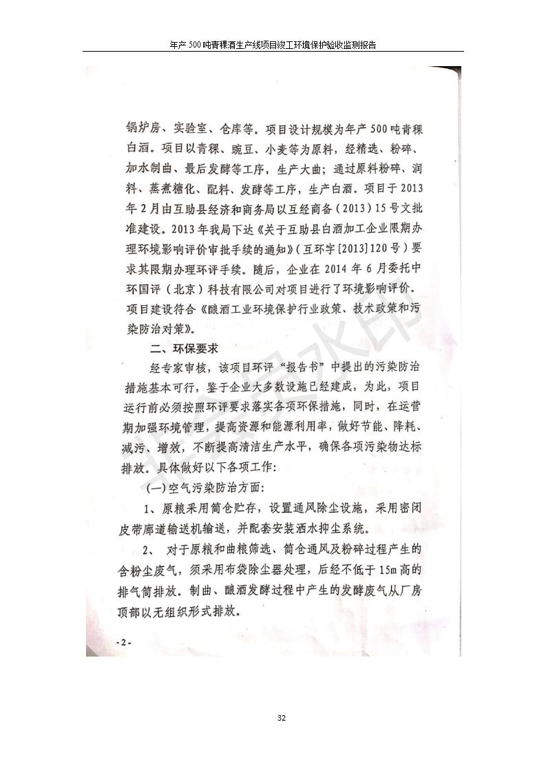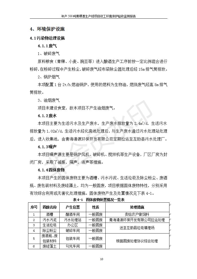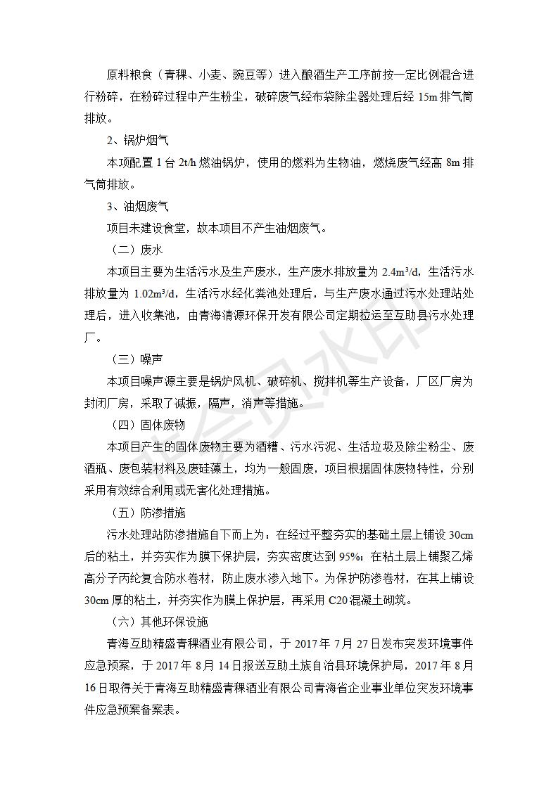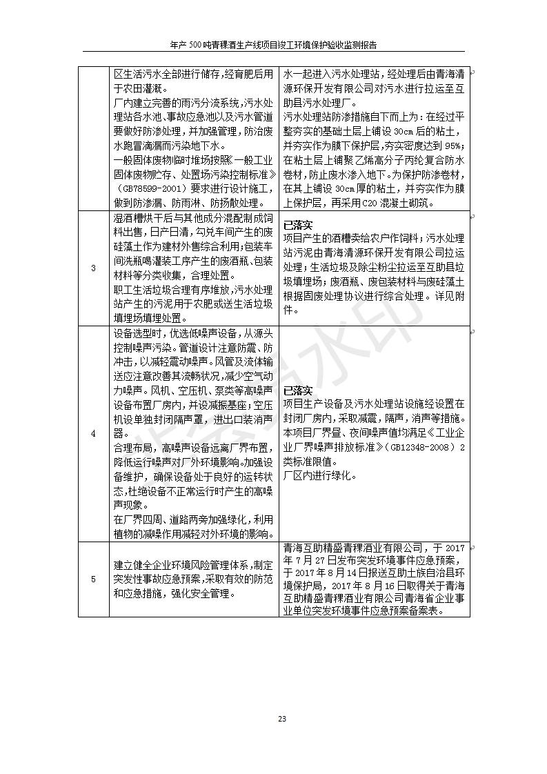 根據(jù)中華人民共和國(guó)國(guó)務(wù)院令第682號(hào)《國(guó)務(wù)院關(guān)于修改〈建設(shè)項(xiàng)目環(huán)境保護(hù)管理?xiàng)l例〉的決定》和《建設(shè)項(xiàng)目竣工環(huán)境保護(hù)驗(yàn)收暫行辦法》(國(guó)務(wù)院令682號(hào)),綜合檢測(cè)實(shí)驗(yàn)室建設(shè)項(xiàng)目(包括竣工環(huán)境保護(hù)驗(yàn)收監(jiān)測(cè)報(bào)告表和驗(yàn)收意見(jiàn))公示如下。 一、項(xiàng)目名稱(chēng):青;ブ⑶囡茦I(yè)有限公司年產(chǎn)500噸青稞酒業(yè)生產(chǎn)線建設(shè)項(xiàng)目 二、地點(diǎn):青海省海東市互助土族自治縣臺(tái)子鄉(xiāng)河?xùn)|村198號(hào)