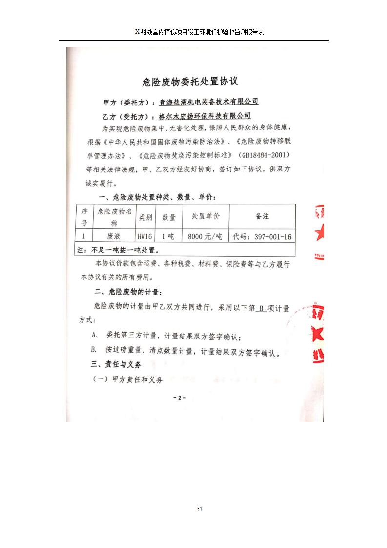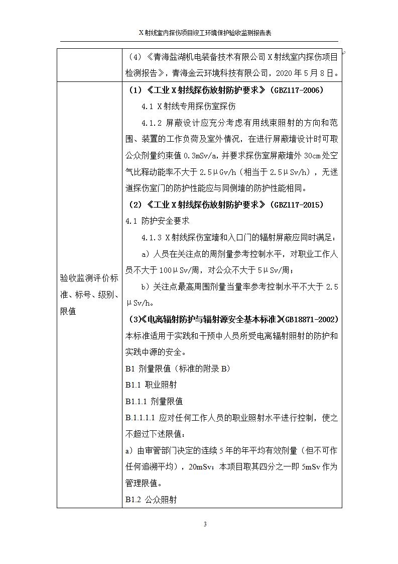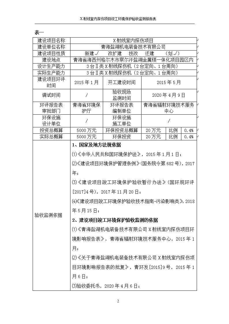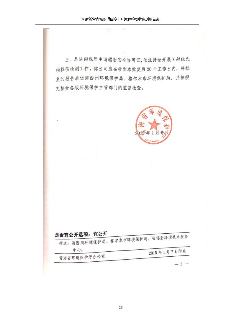 根據(jù)中華人民共和國國務(wù)院令第682號《國務(wù)院關(guān)于修改〈建設(shè)項(xiàng)目環(huán)境保護(hù)管理?xiàng)l例〉的決定》和《建設(shè)項(xiàng)目竣工環(huán)境保護(hù)驗(yàn)收暫行辦法》(國務(wù)院令682號),青海鹽湖機(jī)電裝備技術(shù)有限公司X射線室內(nèi)探傷項(xiàng)目竣工環(huán)境保護(hù)驗(yàn)收監(jiān)測報告表公示如下。 一、項(xiàng)目名稱:X射線室內(nèi)探傷項(xiàng)目竣工環(huán)境保護(hù)驗(yàn)收監(jiān)測報告表 二、地點(diǎn):青海省海西州格爾木市察爾汗鹽湖金屬鎂一體化項(xiàng)目園區(qū)內(nèi) 三、建設(shè)單位:青海鹽湖機(jī)電裝備技術(shù)有限公司 四、建設(shè)內(nèi)容:本項(xiàng)目位于公司三號車間廠房內(nèi),探傷室長21m,寬9.3m,共有3臺X射線探傷機(jī)。 五、聯(lián)系人:楊工 六、聯(lián)系電 話:0971-6515411 七、公示時間:二〇二〇年七月十日至二〇二〇年八月六日 公示期間,對上述公示內(nèi)容如有異議,請以書面形式反饋,個人須署真實(shí)姓名,單位須加蓋公章。